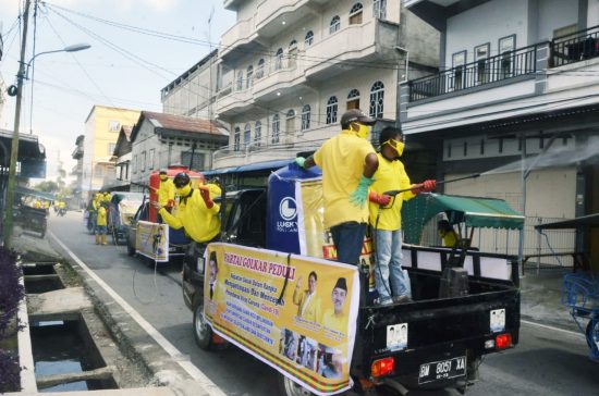 MERANTI, lexario.biz – Amyurlis alias Ucok anggota DPRD Provinsi Riau dari Fraksi partai Golkar bersama Tim Relawan Amyurlis (TIRAM) dan Becak Meranti Wisata (BMW) gelar aksi sosial pembagian masker, penyemprotan desinfektan sekaligus penyemprotan bahaya DBD demam berdarah (fogging) bertempat sepanjang ruas jalan umum di kota Selatpanjang Kecamatan Tebing tinggi, Ahad (19/04).