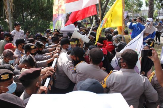 “Saat masa aksi mencoba menerobos masuk kami mendapatkan perlakuan represif dari aparat kepolisian, disaat saya mengamankan masa aksi salah satu oknum aparat menarik saya dan memukul saya dari belakang namun hal tersebut dapat dihindari karena kesigapan teman-teman masa aksi,” terang Irfan.
