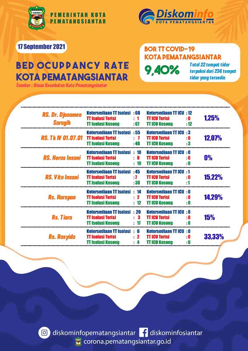 P.SIANTAR, lexario.biz – Bed Occupancy Rate (BOR) kota Pematangsiantar terus mengalami penurunan. Melihat dari data Diskominfo kota Pematangsiantar yang bersumber dari Dinas kesehatan kota Pematangsiantar, Ahad (19/09) BOR kota Pematangsiantar 8,12 persen dari 234 TT (tempat tidur) yang tersedia diberbagai rumah sakit yang tersebar di kota Pematangsiantar artinya hanya 19 TT yang terpakai.