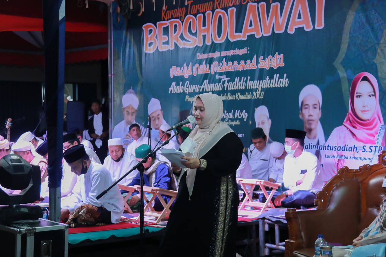 Bupati Bengkalis, Kasmarni hadir dalam kegiatan Karang Taruna Rimba Sekampung Bersholawat ini yang dipandu oleh Pengasasuh Majelis Ilmu dan Amal Al Burdah Baa Khaalish 2002, Abah Ahmad Fadhli Inayatullah.