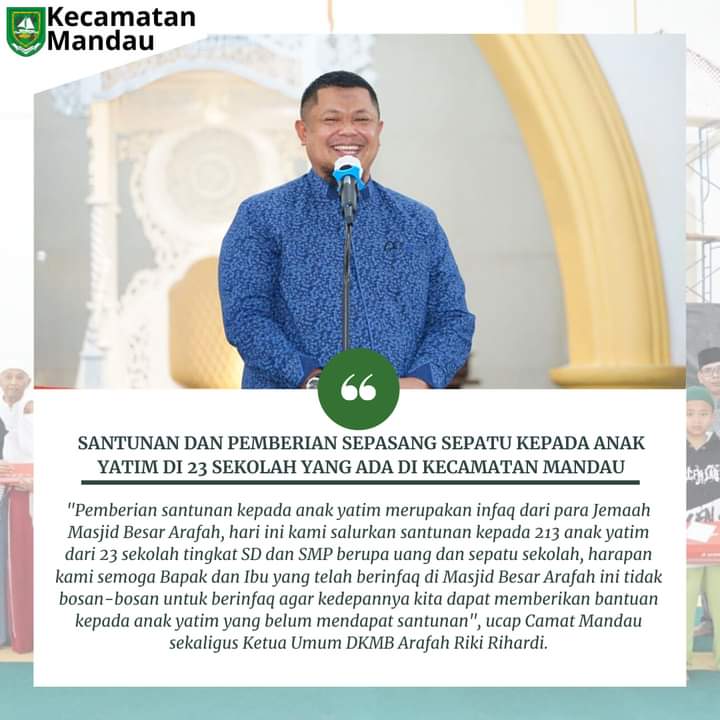 Ketua DKMB Arafah Riki Rihardi mengungkapkan, santunan ini merupakan hasil dari infaq yang diberikan Jemaah Masjid Besar Arafah untuk anak yatim.