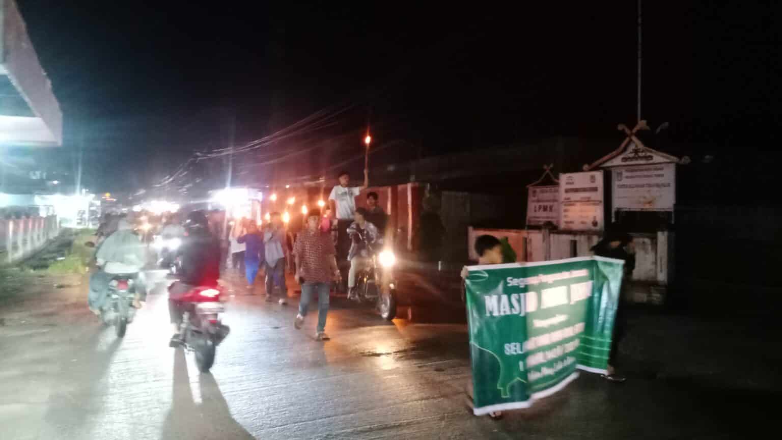 Begitu hujan reda, jamaah berbaris didepan Masjid Nurul Janah dengan memegang obor berkeliling sembari melantukan takbir.