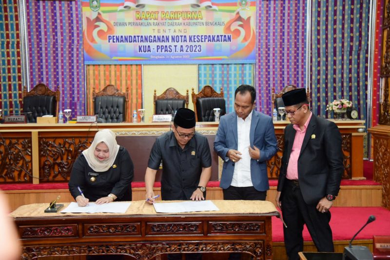 BENGKALIS, lexario.biz – Bupati Bengkalis Kasmarni bersama Ketua DPRD Kabupaten Bengkalis H. Khairul Umam menandatangani Nota Kesepakatan (MoU) tentang perubahan Kebijakan Umum Anggaran (KUA) dan Perubahan Prioritas Plafon Anggaran Sementara (PPAS) APBD Kabupaten Bengkalis tahun anggaran 2023, Rabu 31/08, di ruang Sidang Paripurna DPRD Bengkalis.