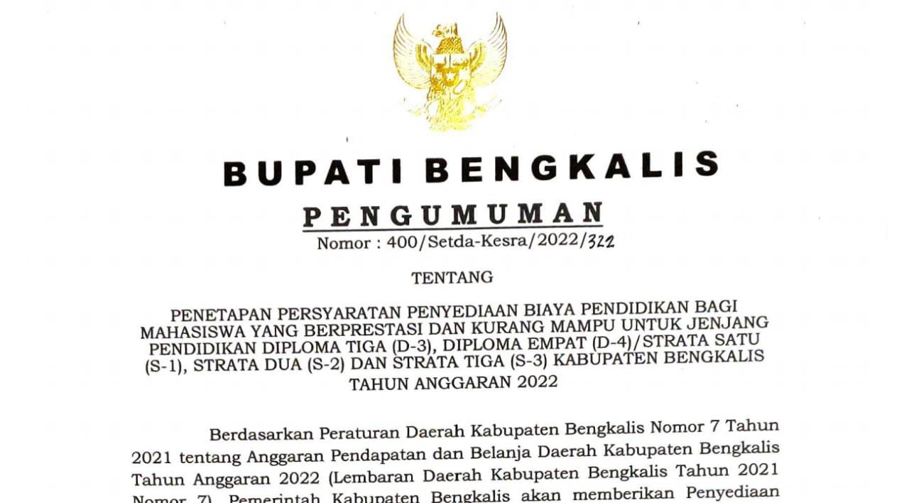 Pengumuman penerimaan Beasiswa ini tertuang dalam pengumuman Bupati Bengkalis nomor 400/Setda-Kesra/2022/322, tentang penetapan persyaratan penyediaan biaya pendidikan kepada mahasiswa berprestasi dan kurang mampu tahun 2022.