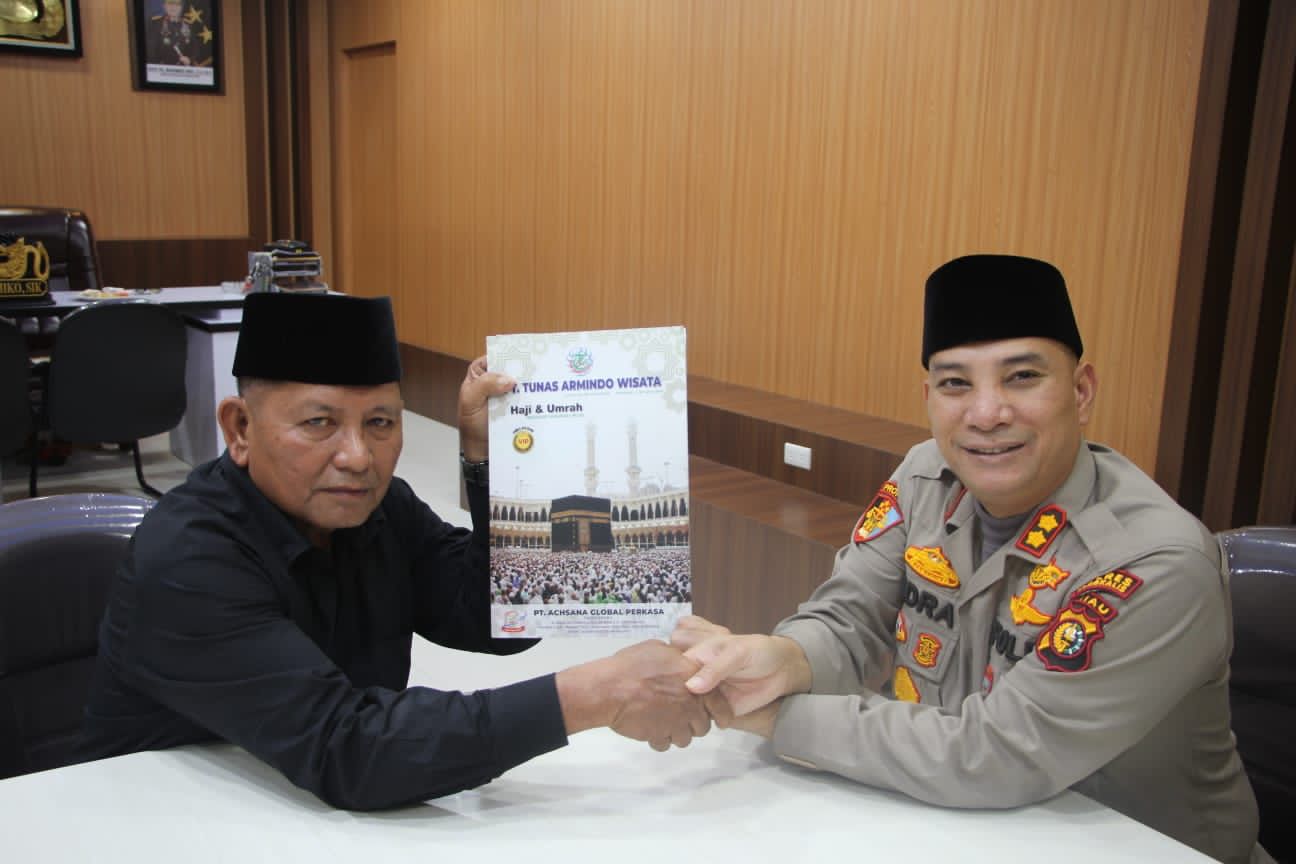 Dalam kesempatan pelepasan ibadah umroh tersebut, Kapolres Bengkalis AKBP Indra Wijatmiko, S.I.K menyerahkan tanda pembayaran lunas keberangkatan Ibadah Umrah Aiptu (Purn) Azhar.