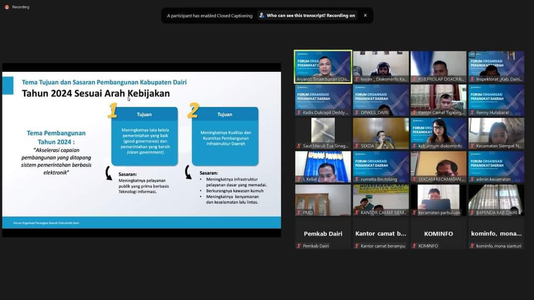 DAIRI, lexario.biz – Dinas Komunikasi dan Informatika (Diskominfo) Kabupaten Dairi menyelenggarakan Forum Organisasi Perangkat Daerah, Senin (6/3). Kegiatan ini dibuka Sekretaris Daerah Kabupaten Dairi, Budianta Pinem melalui daring.