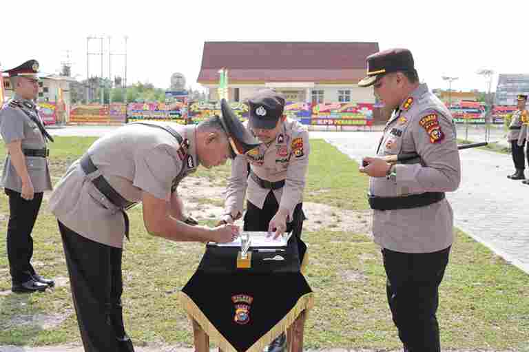 Upacara diawali dengan penyerahan tanda jabatan Kabag Ren kepada Kapolres Kepulauan Meranti AKBP Andi Yul LTG SH SIk MH.