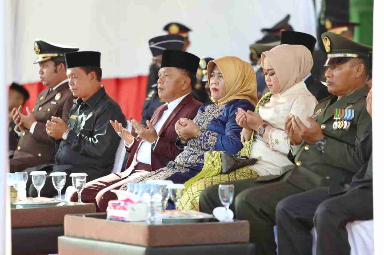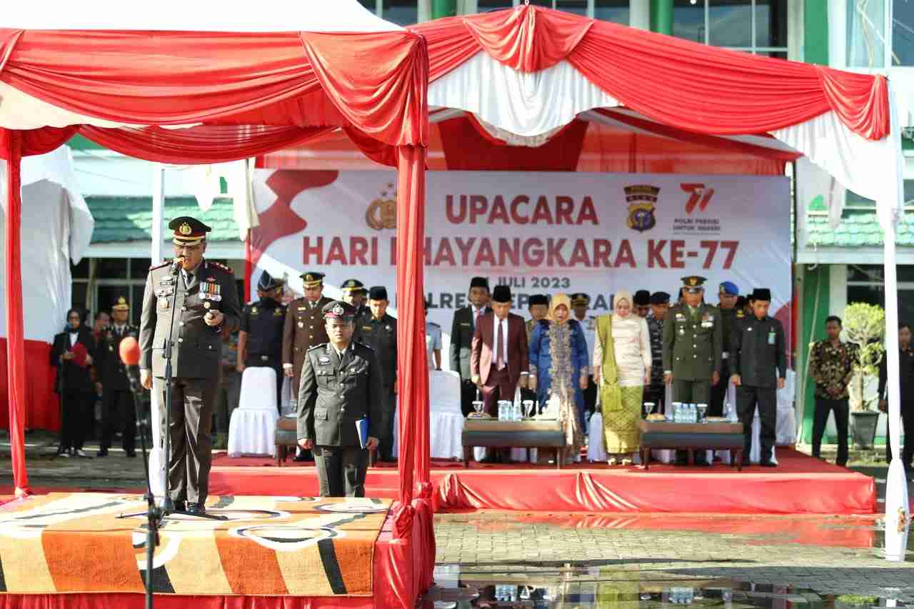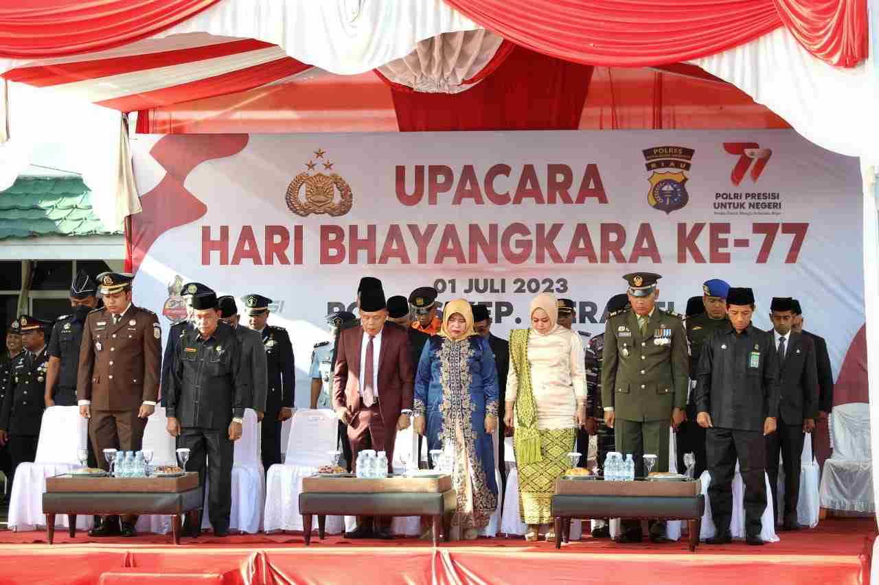 Pelaksana tugas (Plt) Bupati Kepulauan Meranti AKBP (Purn) H. Asmar beserta jajaran Forkopimda mengikuti upacara peringatan Hari Bhayangkara ke-77 di Halaman Kantor Bupati, Selatpanjang, Sabtu (1/7/2023).