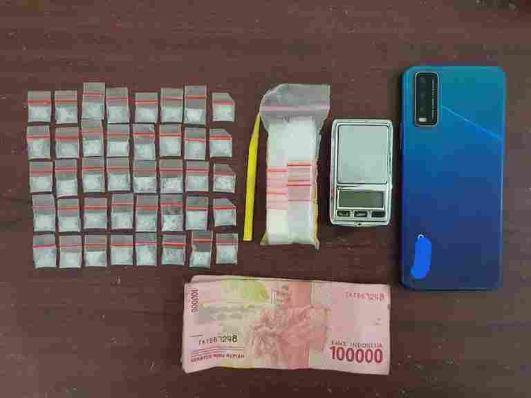 Kemudian tim melakukan penangkapan dan pengeledahan ditemukan 40 (empat puluh) bungkus plastik pack berisi diduga narkotika jenis sabu berat 6.77 gram, 1 (satu) bungkus plastik pack kosong, 1 (satu) unit timbangan, 1 (satu) buah sendok sabu, 1 (satu) unit handphone android merk vivo warna biru dan Uang Tunai Rp. 300.000 (tiga ratus ribu rupiah).