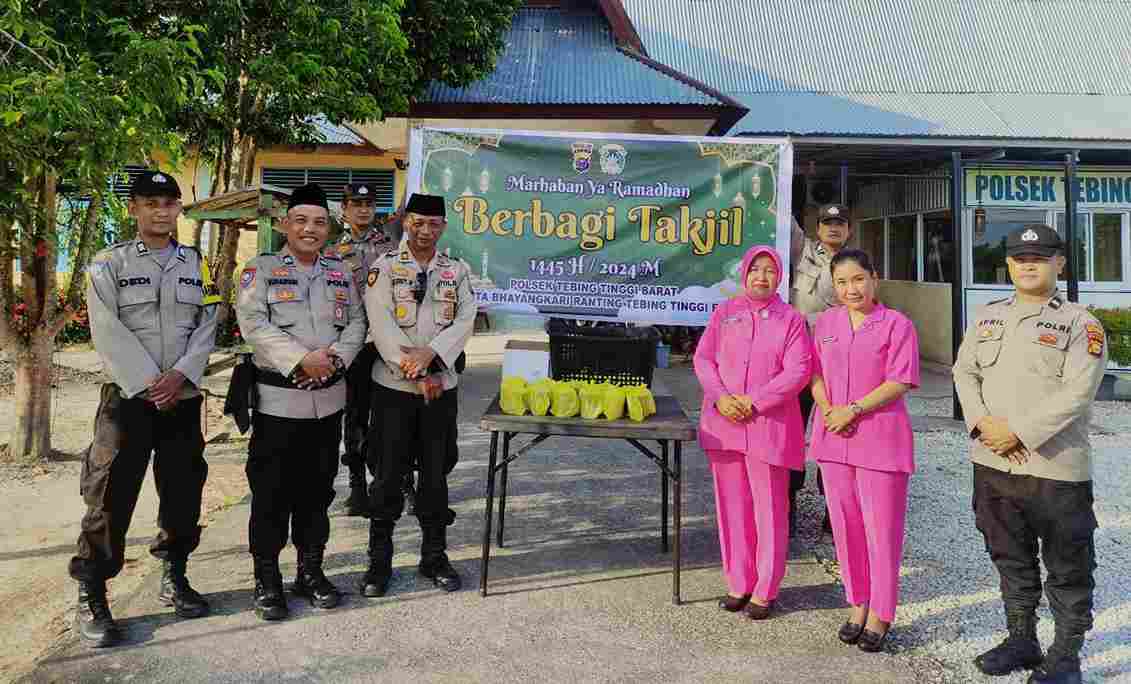 MERANTI, lexario.biz – Bhayangkari Polisi sektor Tebing tinggi barat membagikan Takjil Ramadhan bertempat di Depan Mako Polsek Tebing Tinggi Barat Jalan Perumbi Kecamatan Tebing Tinggi Barat, Sabtu (16/03)