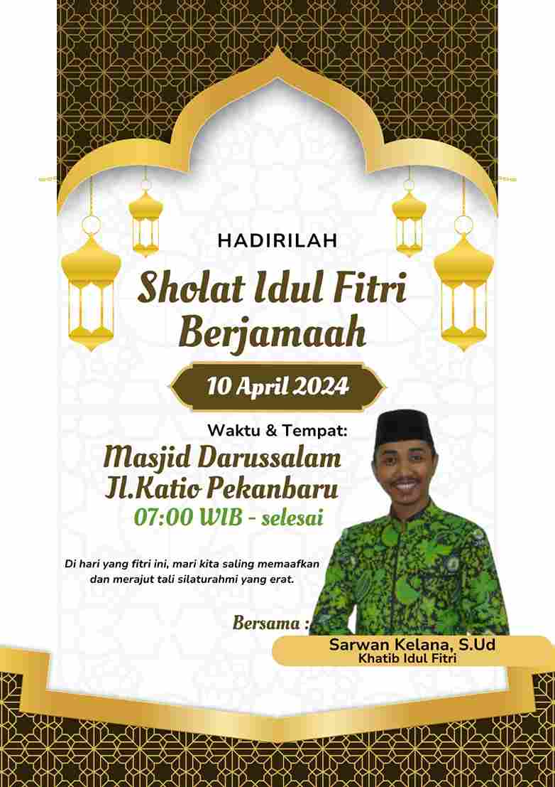 ” Alhamdulillah Idul Fitri tahun ini kami diberi amanah oleh Pengurus Masjid Darussalam, untuk menyampaikan Khutbah Idul Fitri 1445H. Alhamdulillah besok kalau tak ada aral melintang makan kami akan mengisi di sana .” kata Sarwan Kelana, selasa (09/04).