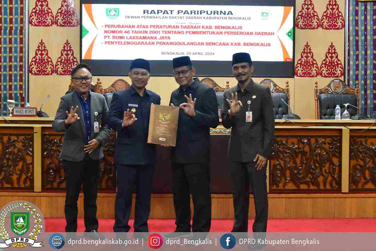 Diakhir pertemuan, Wakil Ketua DPRD Kabupaten Bengkalis mengucapkan terima kasih kepada Bupati Kabupaten Bengkalis Kasmarni yang diwakili oleh Bagus Santoso yang telah menyampaikan dua Rancangan Peraturan Daerah tersebut supaya bisa secepatnya terakomodir.