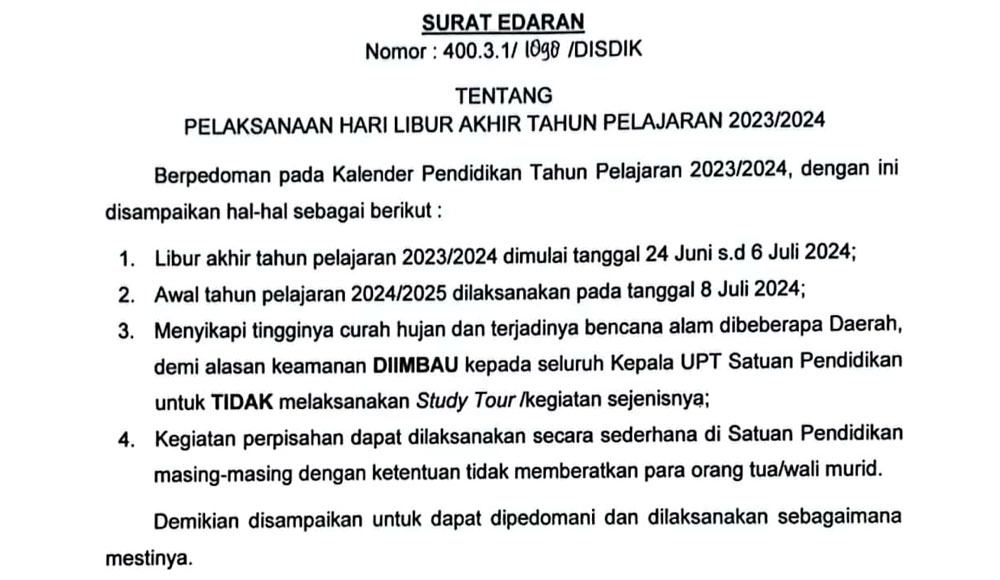 Kemudian, merujuk pada kalender pendidikan tahun pelajaran 2023/2024, Hadi juga menyampaikan kembali masa libur akhir tahun terhitung 24 Juni s.d 6 Juli 2024.