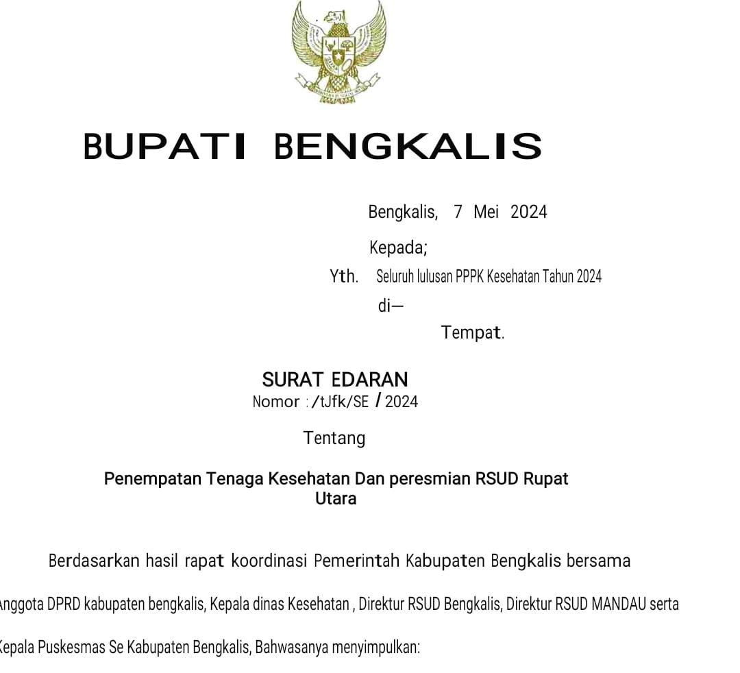 Saat ini viral Surat Edaran (SE) yang di tandatangani langsung oleh Bupati Bengkalis Kasmarni tentang Penempatan Tenaga Kesehatan dan Peresmian RSUD Rupat Utara.