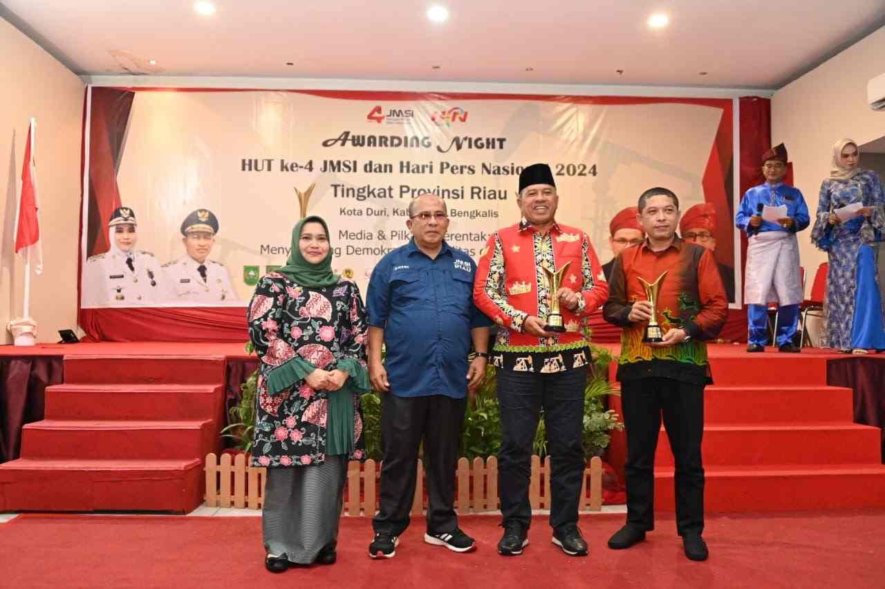 DURI, lexario.biz – Tiga kepala daerah di Provinsi Riau masing-masing Bupati Bengkalis Kasmarni, Bupati Siak Alfedri dan Bupati Pelalawan Zukri meraih penghargaan JMSI Riau Award 2024 yang diserahkan pada malam puncak HUT Jaringan Media Siber Indonesia (JMSI) ke-4 dan Hari Pers Nasional (HPN) 2024 di ballroom Hotel Surya Duri, Sabtu (8/6/2024) tadi malam.