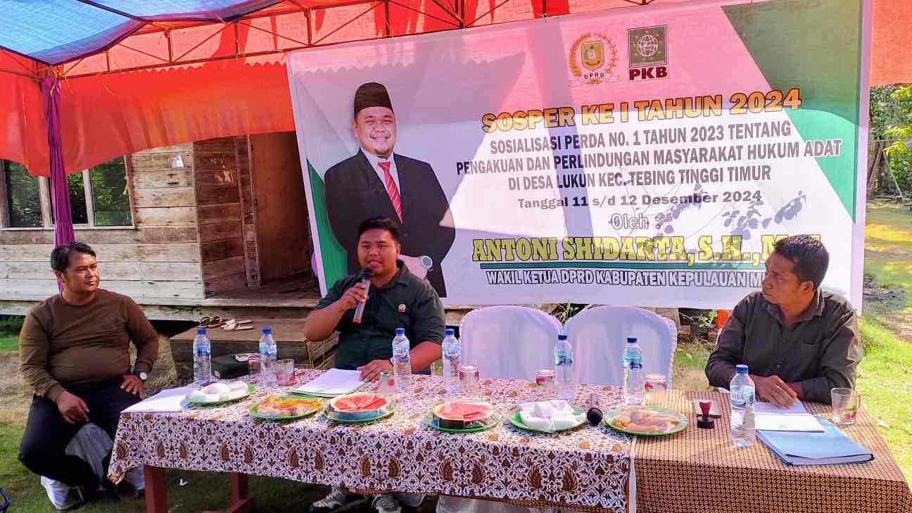 MERANTI, lexario.biz – Wakil Ketua DPRD Kepulauan Meranti, Antoni Shidarta, S.H., M.H., menggelar sosialisasi Peraturan Daerah (Perda) No. 1 Tahun 2023 di Desa Lukun, Kecamatan Tebingtinggi Timur, pada Sabtu (28/12/2024). Kegiatan ini bertujuan memberikan pengakuan dan perlindungan yang lebih baik terhadap masyarakat hukum adat, khususnya di Kepulauan Meranti.