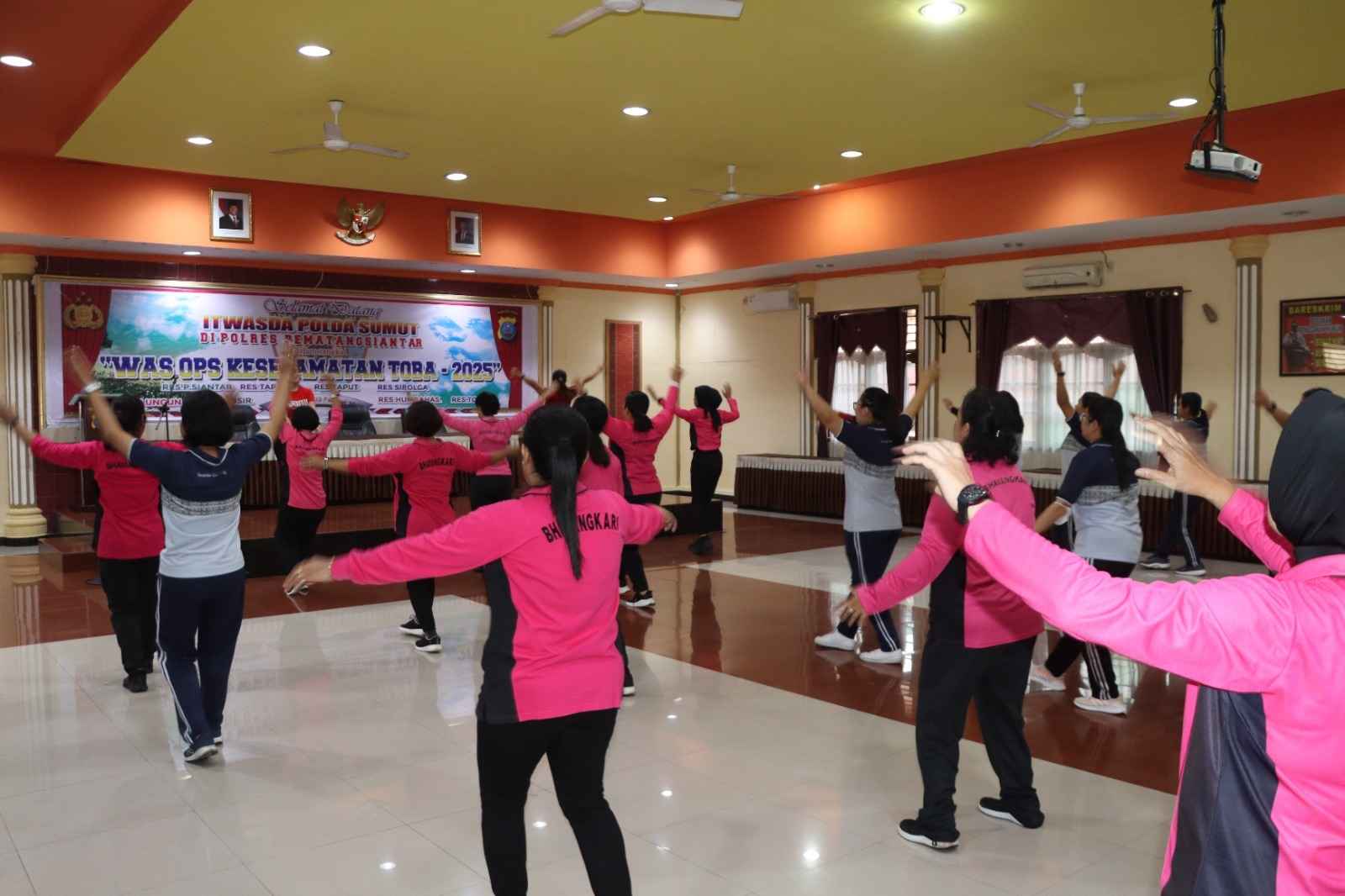 PEMATANGSIANTAR, lexario.biz – Personel Polwan dan ibu Bhayangkari Polres Pematangsiantar menggelar kegiatan olahraga aerobik bersama di Aula Polres Pematangsiantar pada Jumat, 21 Februari 2025. Kegiatan ini bertujuan untuk menjaga kesehatan jasmani serta mempererat tali silaturahmi di antara sesama anggota Polwan dan ibu Bhayangkari.