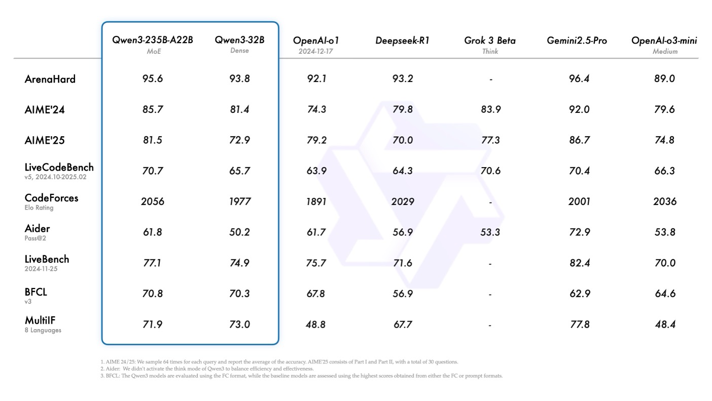 Qwen3 mencetak hasil unggul dalam berbagai benchmark industri seperti AIME25 (matematika), LiveCodeBench (pengkodean), BFCL (function calling), dan Arena Hard (instruksi LLM). Model ini dikembangkan melalui empat tahap pelatihan: cold start dengan long chain-of-thought (CoT), reinforcement learning berbasis penalaran, thinking mode fusion, dan general RL.