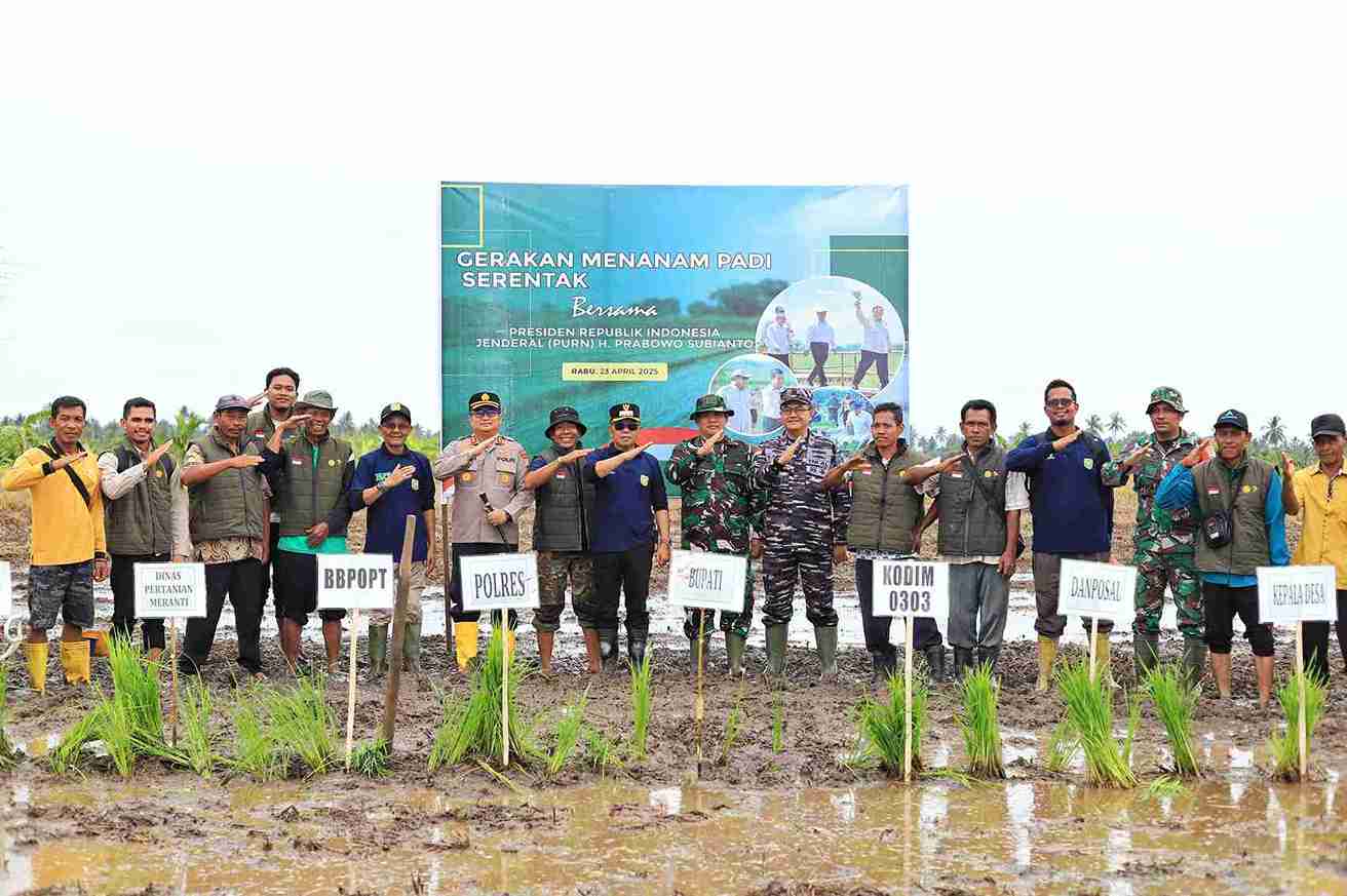 MERANTI, lexario.biz – Bupati Kepulauan Meranti, AKBP (Purn) H. Asmar, bersama Forum Koordinasi Pimpinan Daerah (Forkopimda) menanam benih padi secara serentak di lahan persawahan Desa Mekar Baru, Kecamatan Rangsang Barat, Rabu (23/4/2025). Kegiatan ini merupakan bagian dari gerakan nasional penanaman padi yang dilaksanakan serentak di 14 provinsi di Indonesia, yang dipusatkan di Ogan Ilir, Sumatera Selatan dan dihadiri langsung oleh Presiden Prabowo Subianto.