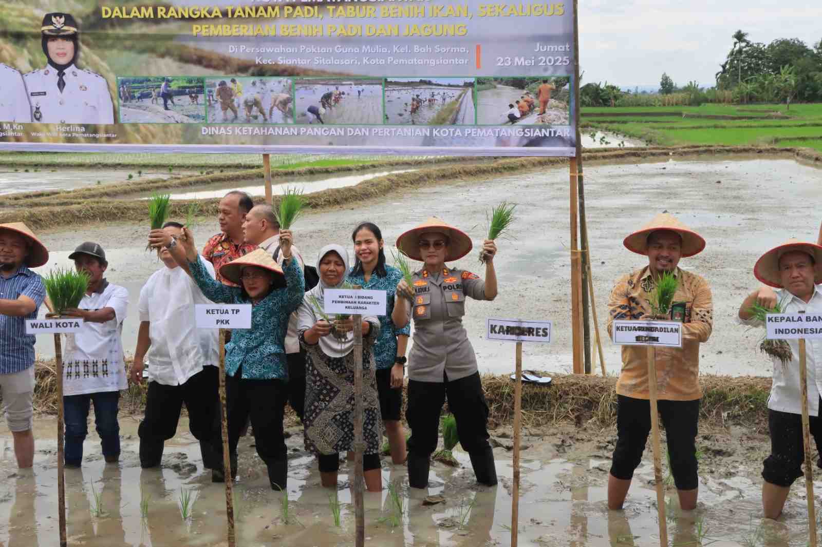 PEMATANGSIANTAR, lexario.biz – Pemerintah Kota Pematangsiantar bersama Forum Koordinasi Pimpinan Daerah (Forkopimda) menunjukkan komitmen kuat dalam menjaga ketahanan pangan melalui kegiatan terpadu pembagian benih, penebaran bibit ikan, dan penanaman padi di Kelurahan Bah Sorma, Kecamatan Siantar Sitalasari.