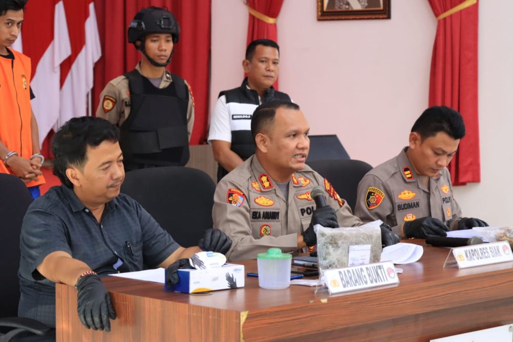Kapolres Siak, AKBP Eka Ariandy Putra SH SIK MSi, saat konferensi pers di Mapolres, Kamis (31/7/2025), menjelaskan, “Dari tangan tersangka ditemukan empat paket kecil ganja siap edar dengan berat total 6,8 gram.”